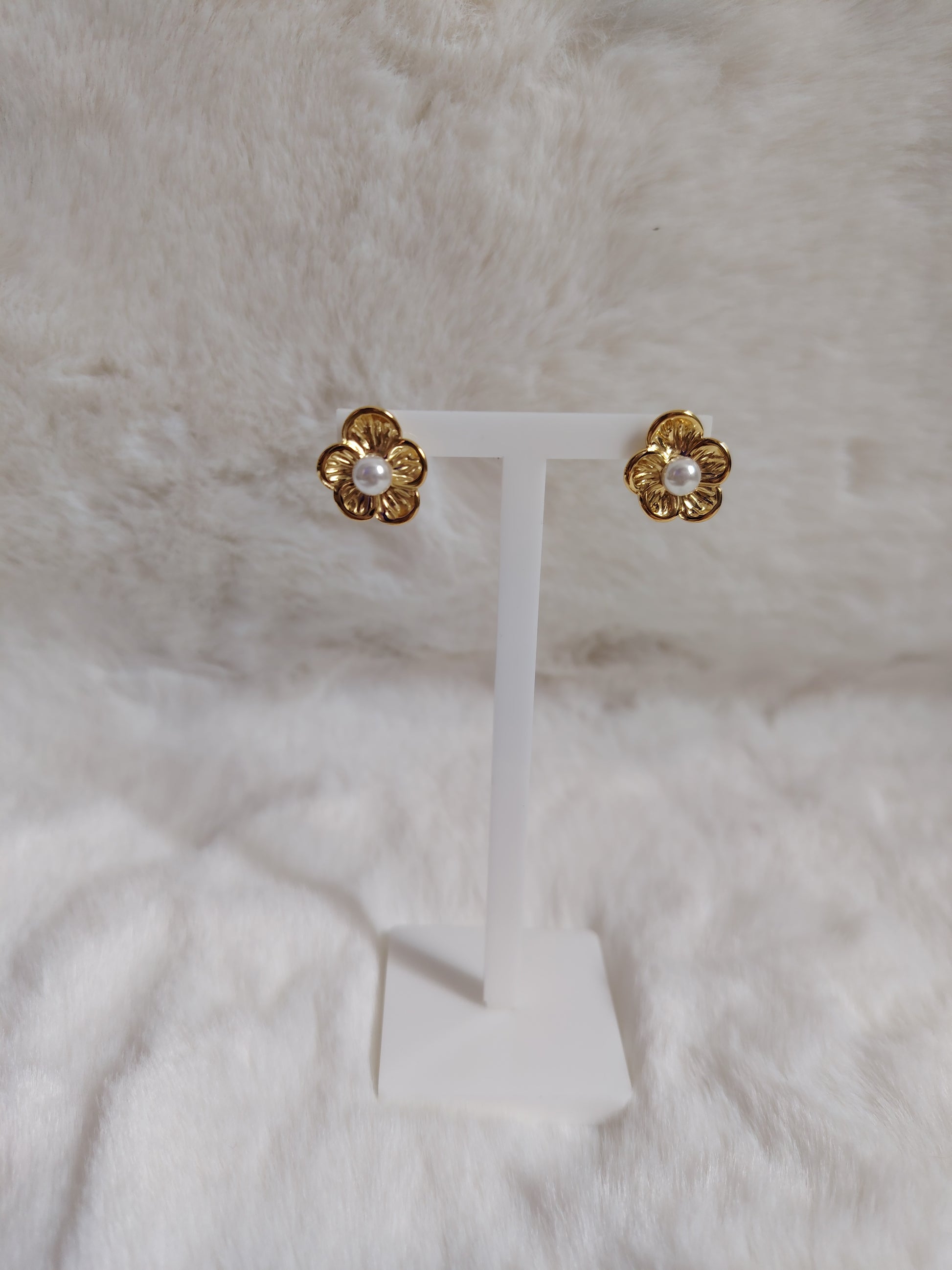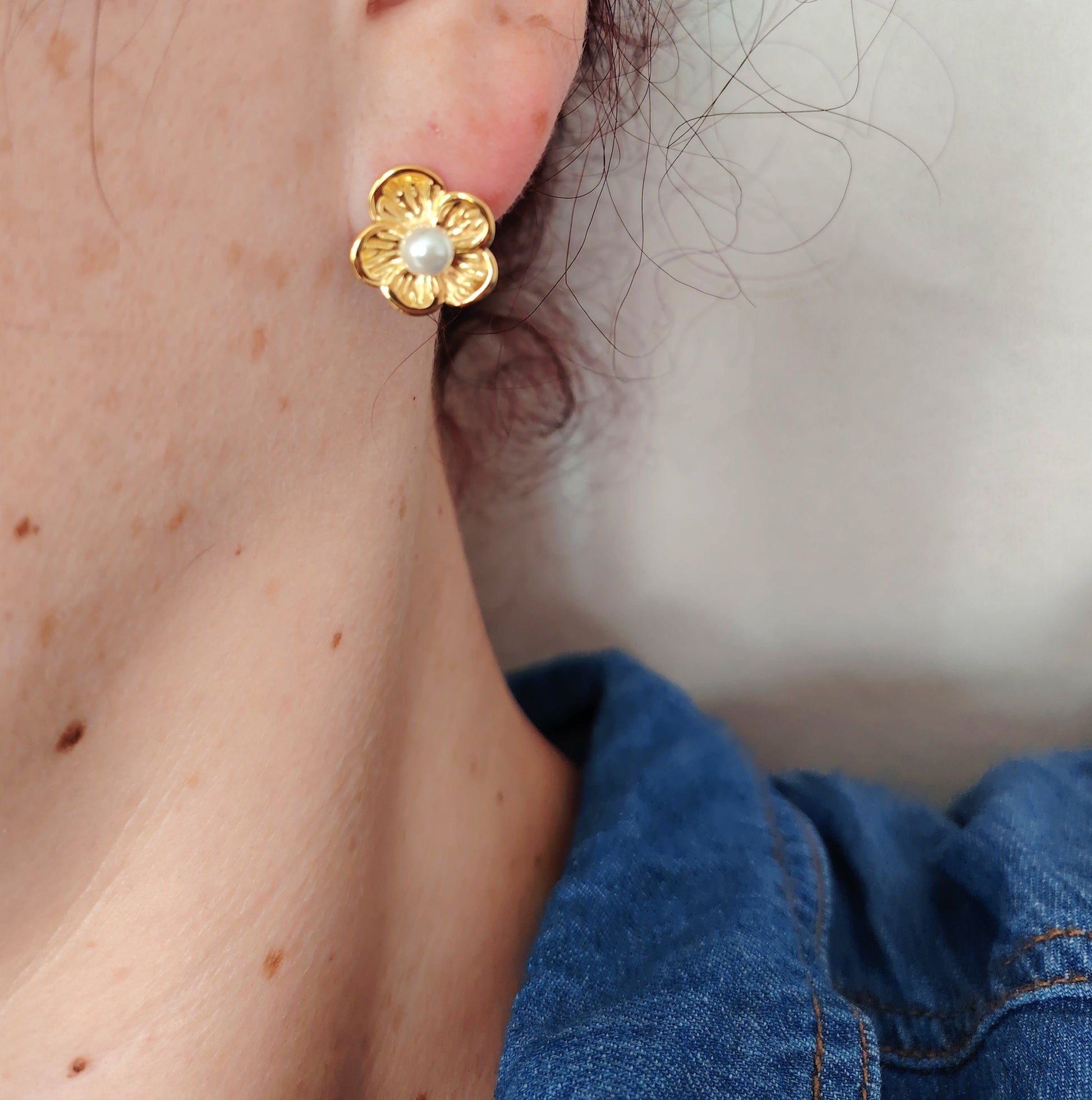 Boucle d'oreille en forme de fleur en acier inoxydable doré , sublimée par une perle au centre .